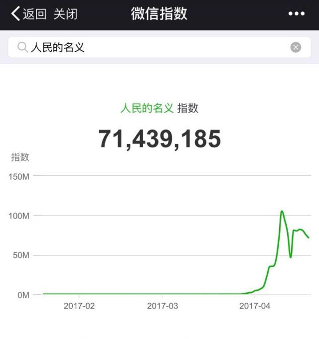 这张图是近期大火的电视剧“人民的名义”的关键词热度。4月后突然间暴涨,这是符合情理的。毕竟,第一集播出的时间是3月28日。