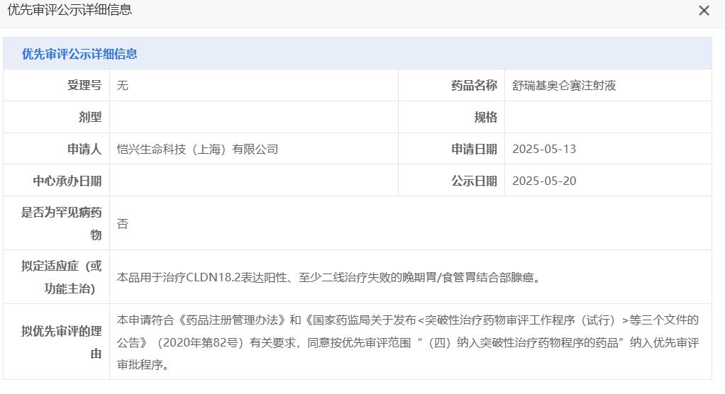 5月20日,国家药监局审评中心官网公示,科济药业的1类新药舒瑞基奥仑赛注射液拟被纳入优先审评,用于治疗CLDN18.2表达阳性、至少二线治疗失败的晚期胃/食管胃结合部腺癌。