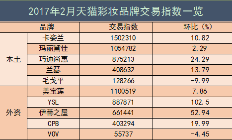 从2017年2月生意参谋发布的天猫美妆品牌交易指数看出,国产前五品牌基本保持环比增加状态,仅有毛戈平交易指数环比呈负增长。