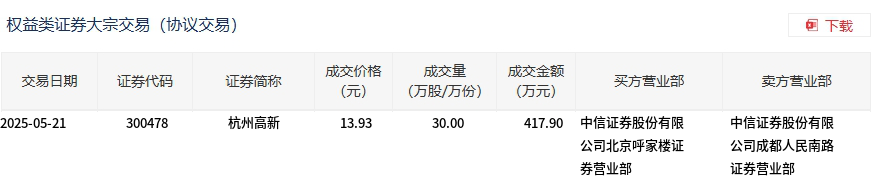 5月21日,杭州高新大宗交易成交30万股,成交额417.9万元,占当日总成交额的1.49%,成交价13.93元,较市场收盘价14.14元折价1.49%。