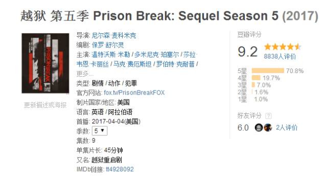 这样你就不难理解为什么《越狱》第五季才刚刚更新了一集,豆瓣上就为这部剧打出了9.3分的高分,说明还有那么多人,在八年没有《越狱》的日子了里,一边等《权利的游戏》,一边刷《绝命毒师》,一边遍览天下好剧,一边还记挂着迈克尔的命运。