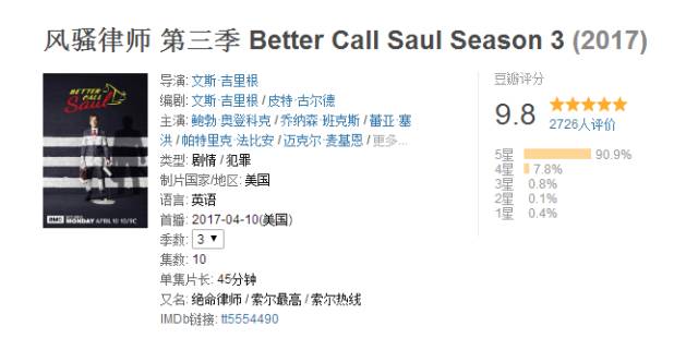 在2017年的这个春天,除了等了八年的《越狱》终于回归了之外,让我们苦等了一年零两个月的《风骚律师》第三季,也终于重上荧屏!作为很多人心目当中“全宇宙最好看剧集”《绝命毒师》的衍生剧,《风骚律师》的前两季无论口碑还是收视,都堪称好到“炸裂”。如今第三季刚一上线,豆瓣上就刷出了9.8分!