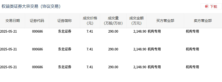 5月21日,东北证券大宗交易成交870万股,成交额6446.7万元,占当日总成交额的40.42%,成交价7.41元,较市场收盘价7.41元持平。