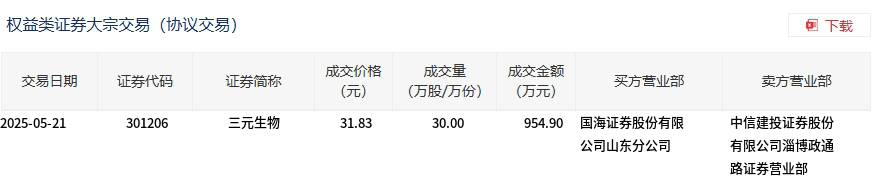 5月21日,三元生物大宗交易成交30万股,成交额954.9万元,占当日总成交额的2.22%,成交价31.83元,较市场收盘价32.15元折价1%。