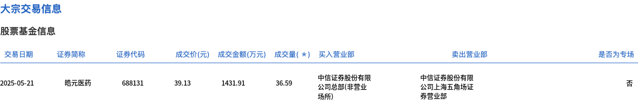 5月21日,皓元医药大宗交易成交36.59万股,成交额1431.91万元,占当日总成交额的11.04%,成交价39.13元,较市场收盘价39.73元折价1.51%。
