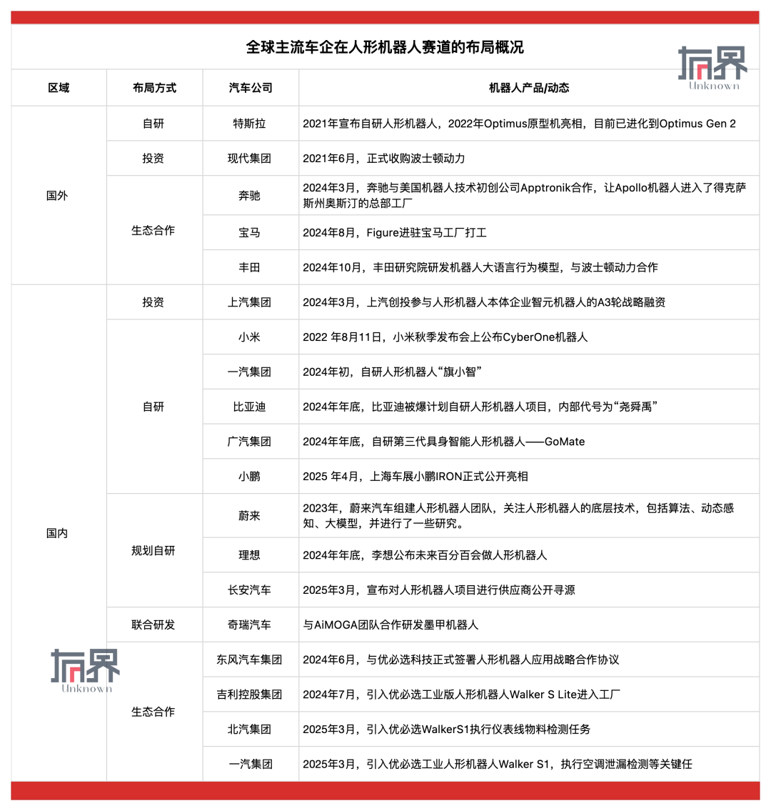 从车展可以看出,车企们对人形机器人赛道的布局愈发密集,根据有界UnKnown不完全统计,全球已有19家知名车企涉足这一赛道。而仔细查看会发现,这股车企造"人"热可以分为两波:第一波是马斯克点的火,第二波是AI添的柴。