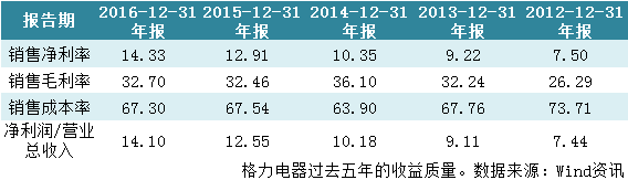 董明珠曾经对媒体表示,对于成为“网红”,她挺骄傲的,因为格力电器的发展较好才使她受到了瞩目。从利润表上看,营业收入增速高于成本增速是格力电器净利润增长的重要原因。2016年,格力电器总营收较上年增长9.5%,总成本较上年增长6.3%。从收益质量上看,虽然销售毛利率与成本率较2015年变化不大,但销售净利率和净利润占营业总收入的比重均有所提高。