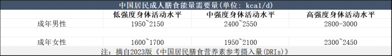 被称为“中国人食谱”的《中国居民膳食指南(2022)》推荐食不过量,保持能量平衡;2023版《中国居民膳食营养素参考摄入量(DRIs)》进一步基于不同人群每天的能量需要量,减肥时推荐每日能量摄入平均降低30%~50%或降低500~1000kcal,或推荐每日能量摄入男性1200~1500kcal、女性1000~1200kcal。