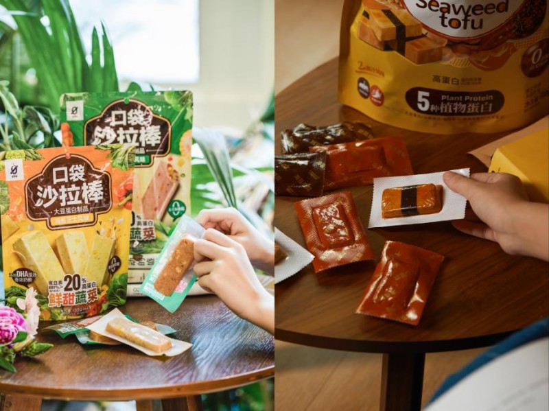 在零售场景中,星期零也用豆制品零食打开了“轻盈又解馋”的新方式。比如星期零口袋沙拉棒的炙烤多蔬风味含有玉米、胡萝卜、杏鲍菇、马蹄、香葱五种蔬菜,蔬菜添加量高达20%;海苔芝士风味则融合玉米、杏鲍菇与DHA藻油,为口感与营养加分。另一款产品海苔豆腐则含有大豆蛋白、小麦蛋白、鹰嘴豆蛋白、豌豆蛋白、大米蛋白5种优质蛋白质,每100克蛋白质含量超过12克,100克海苔豆腐(约5块)的蛋白质含量大于100克纯牛奶的蛋白质含量。