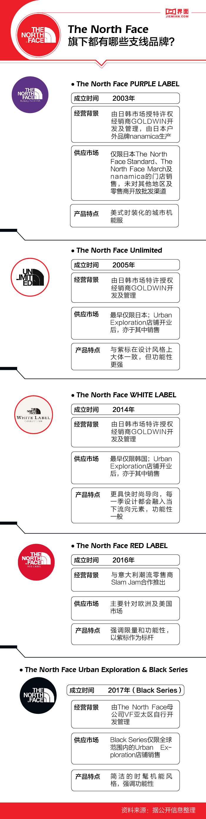 之后,GOLDWIN还在2005年开发了同样针对日本市场Unlimited系列。该支线与紫标设计风格大体相似,却更强调产品功能性。2014年时,GOLDWIN又进军韩国市场,推出更具快时尚属性的白标(The North Face WHITE LABEL)系列。这些支线的存在,与联袂合作一样,都被看作The North Face向时尚界及细分市场靠拢的助力。
