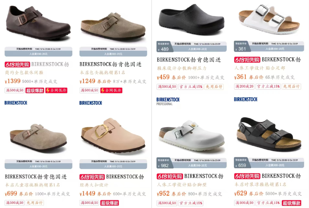 第二,以亚太主要的中国市场为例,在Birkenstock未能实现有力覆盖的广阔市场,存在大量Birkenstock勃肯鞋的平替品牌与白牌产品。其中不乏百丽、天美意等本土老牌鞋企、时尚零售品牌热风等的身影,甚至商超零售山姆等也来横插一脚。