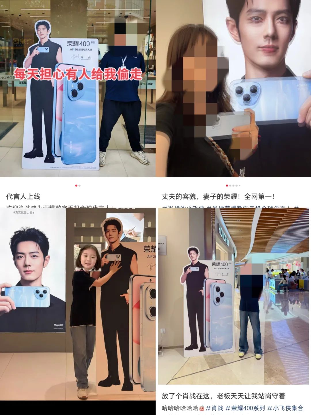 肖战的地推广告在上海陆家嘴、重庆观音桥、成都太古里等地成为粉丝打卡圣地,荣耀线下门店的人形立牌也吸引大量消费者驻足。甚至有工作人员戏称“天天站在肖战旁边守岗”“担心有人偷走(肖战的人形立牌)”。