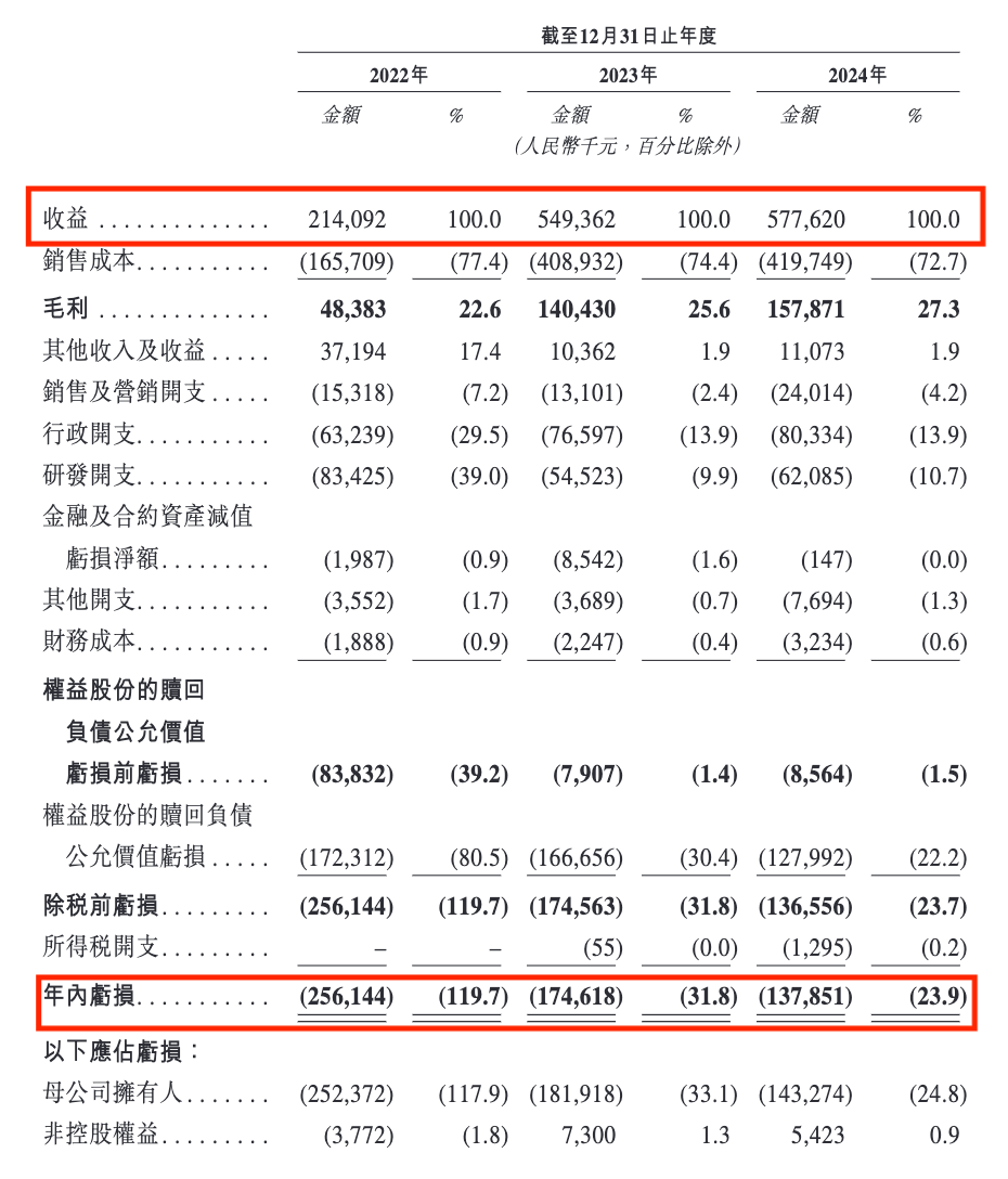 更严峻的是公司亏损状态,过去三年分别实现年内亏损约2.56亿元、1.75亿元及1.38亿元,累计亏损超5.69亿元。年内经调整净利润分别为-7913.2万元、1331.3万元、-713.1万元。即使经调整后,仍累计亏损7295万元。