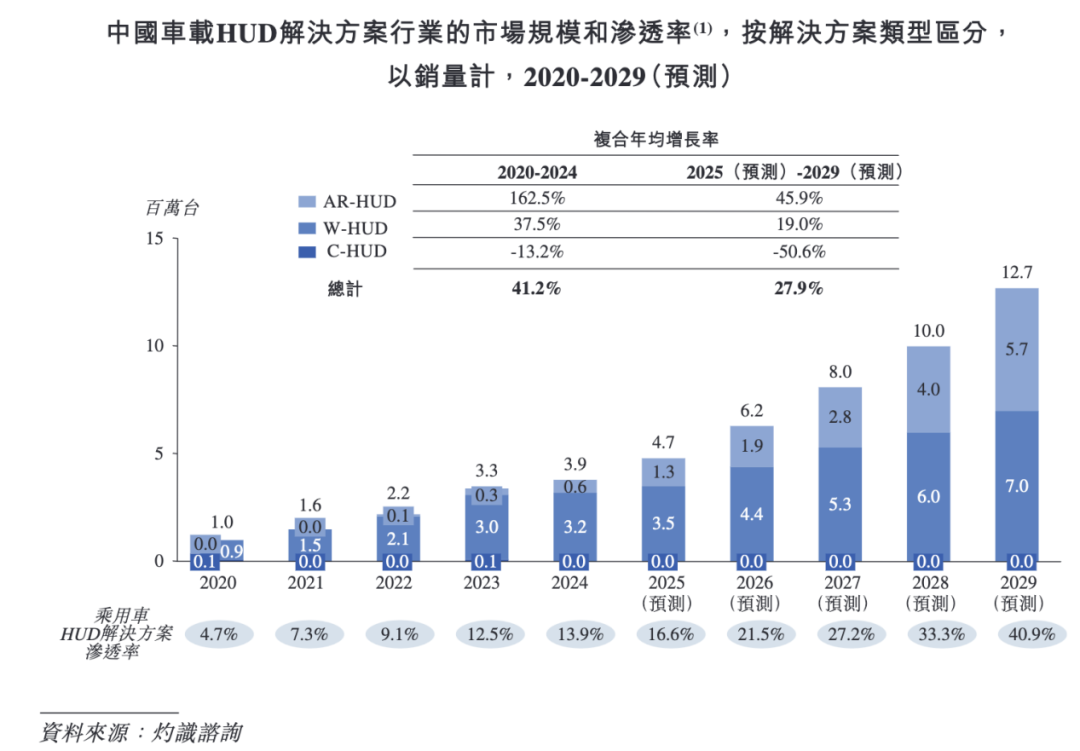在HUD的市场潜力方面,泽景电子在招股书中披露,2020年,车载HUD解决方案市场规模为100万台,到2024年为390万台,预计2029年将达到1270万台。