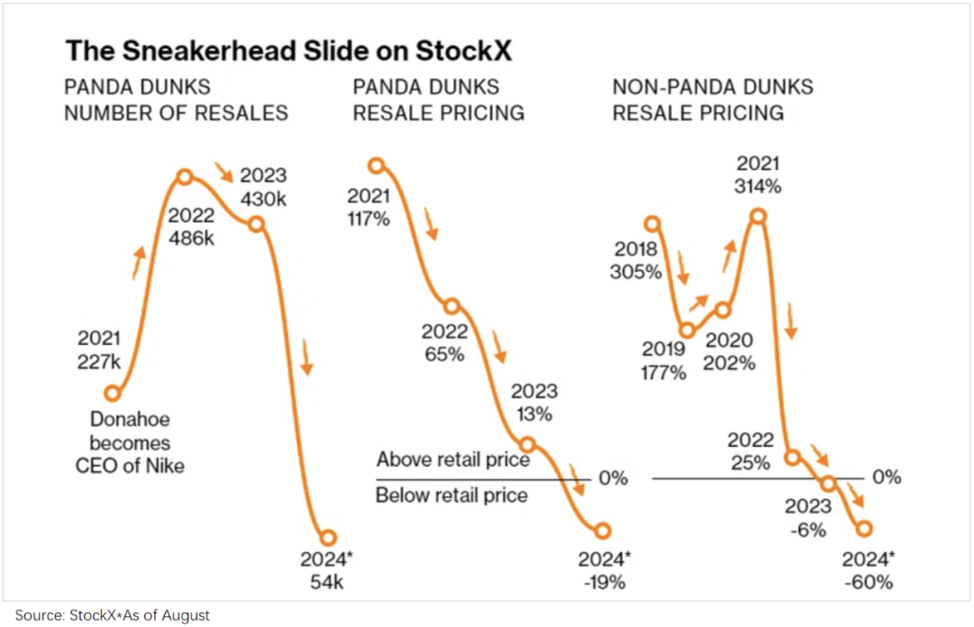 可以看到,满大街泛滥后,曾炒到2万美元的AJ联名款跌破发行价;Dunk也一样:随着销售规模占比升到18%,二级市场价格跌破发行价。