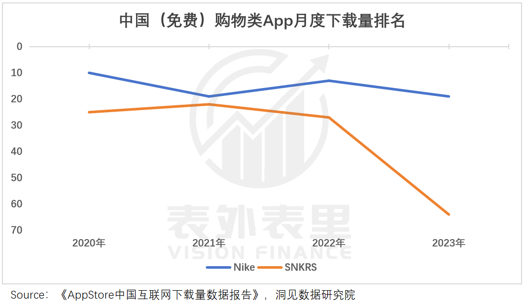 品牌支撑的“基石”一道道崩裂,号召力不复以前。如下图,耐克官方APP以及限量发售为主的SNKRS上线后,仅维持两年流量繁荣,前者就跌至下载量排行榜Top19,后者跌出了Top50。