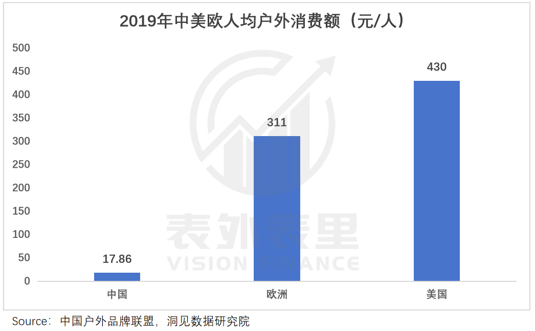 整体来看,国内户外运动市场人均消费仅为20元,约等于欧美的5%,仍坐在市场冷板凳上。