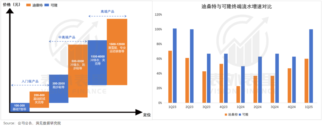 甚至不同品牌数据对比,还能进一步狙击消费市场的缝隙——终端流水显示,对钱包余额更友好的可隆,比迪桑特更有增长动力。