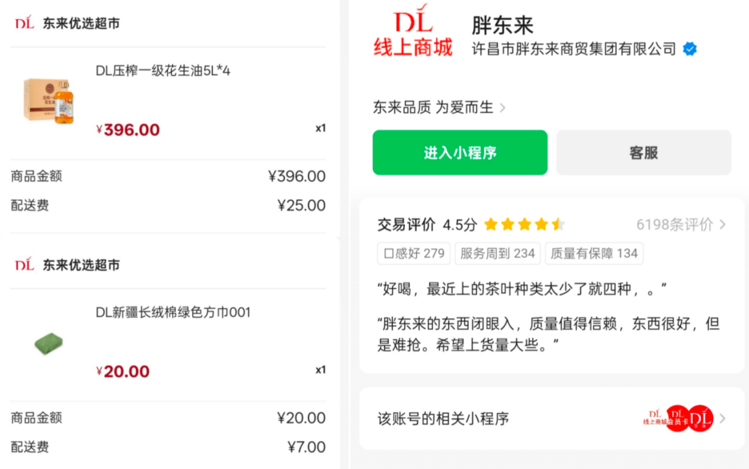 胖东来还有另一款微信购物小程序名为“胖东来百货”,主要提供所选门店内百货商铺的电商服务,比如天使城店的安踏、新乡店的海蓝之谜,而开通百货服务的仅有四家胖东来门店(许昌三家、新乡一家)。