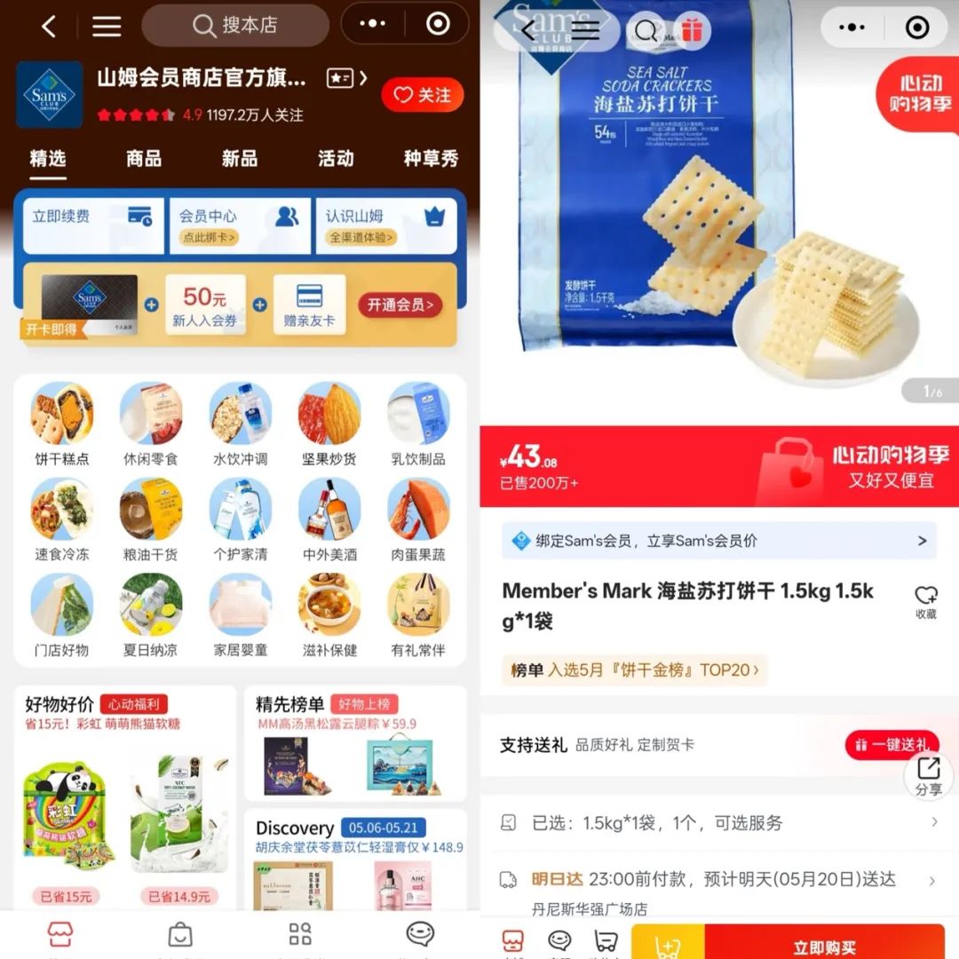 得到沃尔玛官方认证的背后,京东上的山姆会员店官旗店截至目前累计粉丝为1197万,店内最热销的商品为Member’s Mark海盐苏打饼干,显示已售出共计200万+。