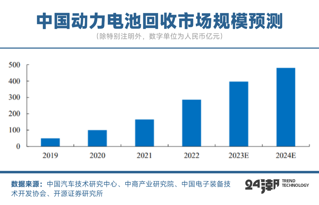 根据中国能源报数据,2019 年我国动力电池回收市场规模约为50亿元。而据中商产业研究院数据,2024年中国动力电池回收市场规模将超过480亿元。可见增长趋势非常强劲。