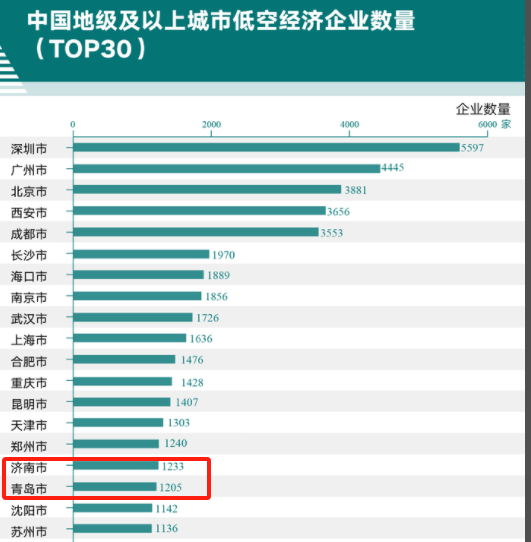 然而,在“中国地级及以上城市低空经济企业数量(TOP30)”榜单中,山东仅有济南(1233家)与青岛(1205家)两座城市入围,分别列第十六、十七位。