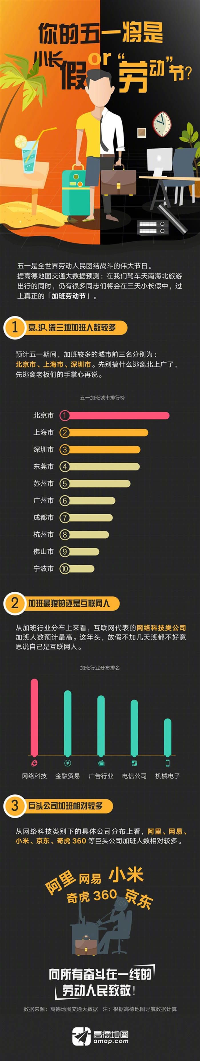 赶在五一小长假之前,高德发布了一份《2017年五一出行预测报告》,根据驾车出行热度和用户导航信息综合预测,这个假期北方热门度假胜地将是景区、度假村/农家院和寺庙道观,而南方热门度假目的地为景区、海滩、纪念馆。其实就算我没有掌握大数据,猜测的也跟这结果差不多。这份预测报告最让人惊讶的是后半部分——加班预测。没错,这份出场华丽的报告,走位就有这么添堵。