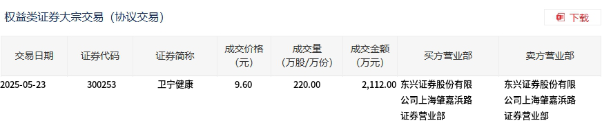 卫宁健康今日大宗交易折价成交220万股,成交额2112万元