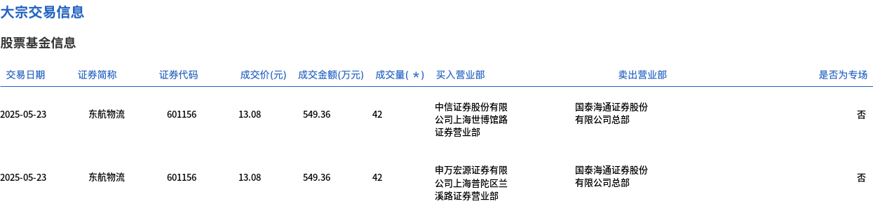 5月23日,东航物流大宗交易成交84万股,成交额1098.72万元,占当日总成交额的5.63%,成交价13.08元,较市场收盘价12.94元溢价1.08%。