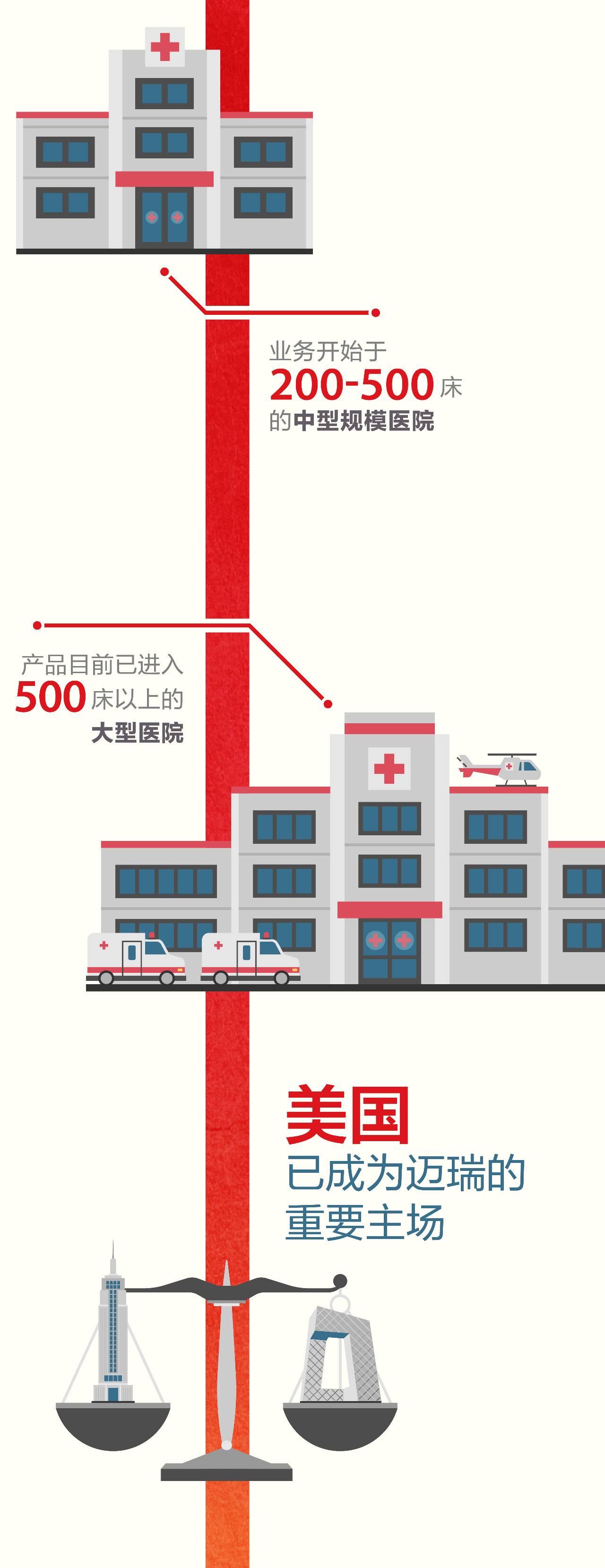 最初,迈瑞与美国中型规模(200-500病床之间)医院合作,到目前迈瑞的产品已经进入越来越多的500床以上的大型医院。