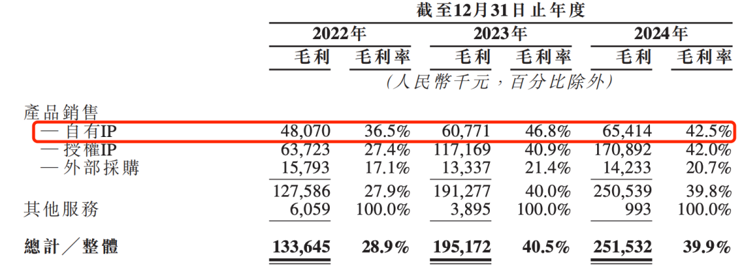 根据招股书,52TOYS在2022年-2024年分别有50.2%、59.3%和64.5%的收入来自授权IP,占比逐年拉大,而授权IP的毛利率普遍低于自有IP。
