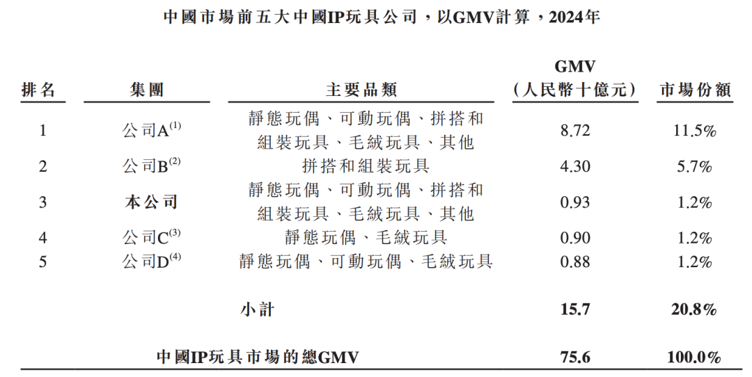 不够亮眼的业绩,也反映在市场份额上。按2024年的GMV计算,52TOYS在中国IP玩具市场中排名第三,但份额仅有1.2%。根据招股书可以推测出,排名第一的公司为泡泡玛特,第二名是布鲁可。