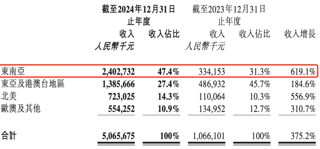 从财报来看,泡泡玛特2024年的业绩增长主要来自海外。其港澳台及海外收入同比增长375.2%至50.66亿元,收入占比近40%。其中东南亚市场收入达24.0亿元,占比47.4%,同比增长619.1%。