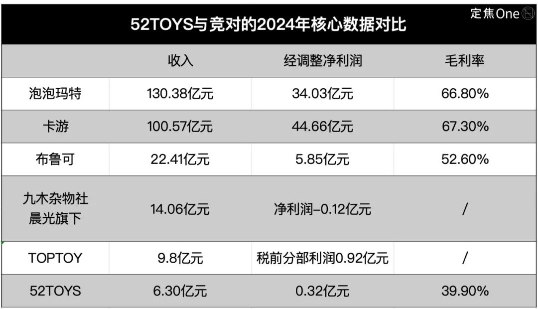 这一表现与头部玩家相比,差距明显。2024年,泡泡玛特的收入是52TOYS的21倍,经调整净利润是其106倍;卡游的收入是52TOYS的16倍,经调整净利润是其139倍。且泡泡玛特和卡游在2024年均保持着收入3位数的增速。