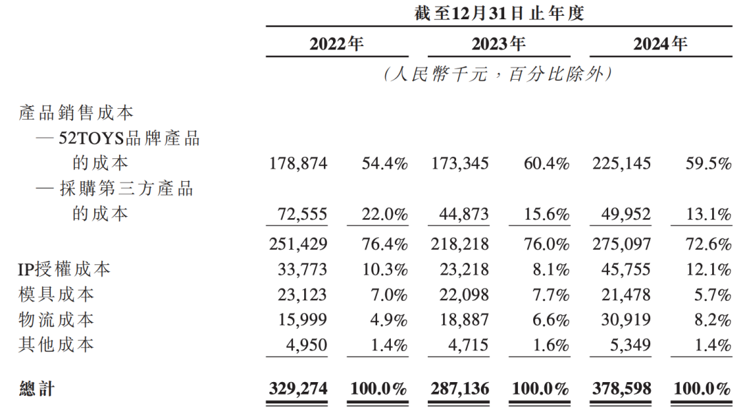 根据招股书,52TOYS在2024年IP授权费达0.46亿元,占比12.1%,而产品销售成本(设计、生产和营销)占比高达72.6%。