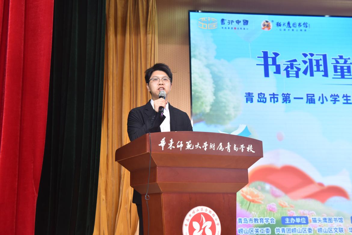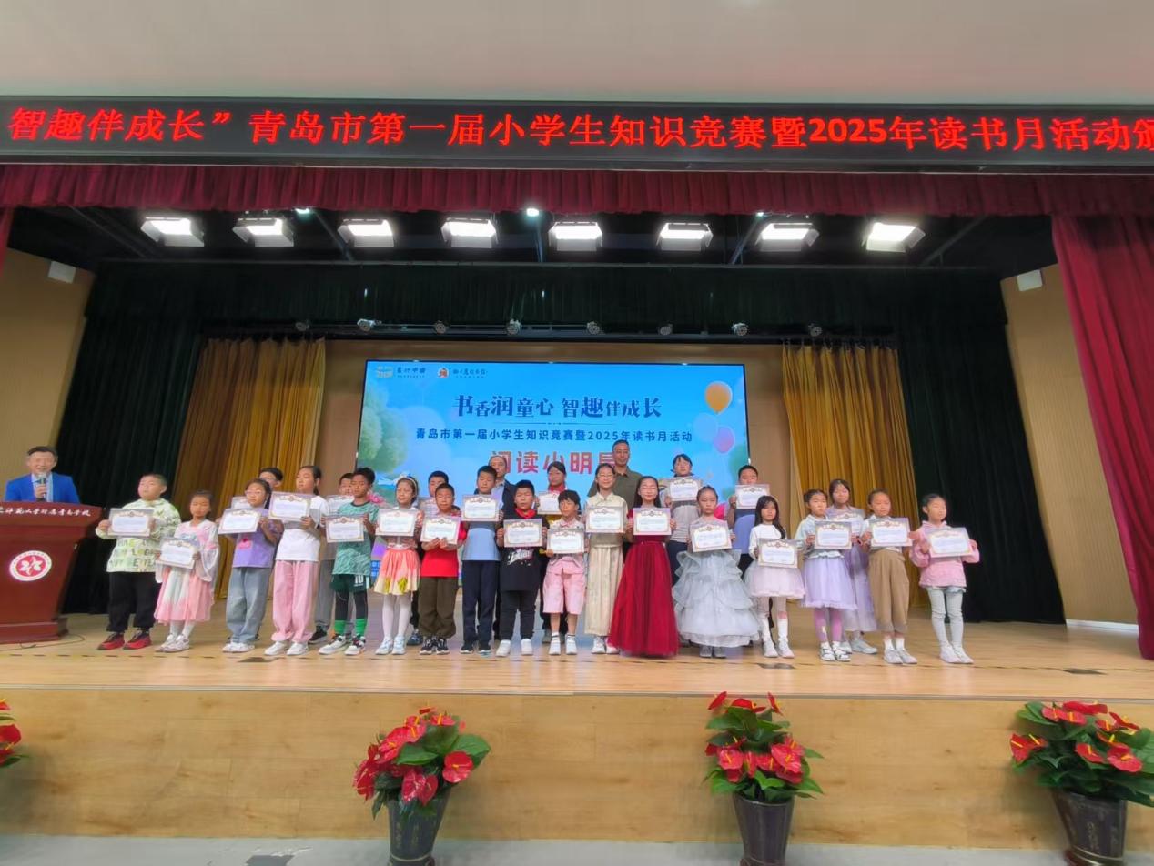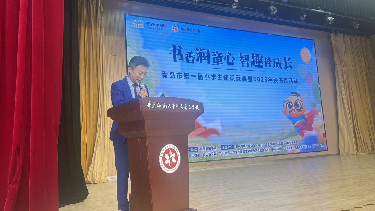 为深入贯彻党的二十大关于深化全民阅读重要部署,推动落实《全国青少年学生读书行动实施方案》、《青岛市促进中小学生全面发展“十个一”项目行动计划》有关要求,5月24日上午,由青岛市教育学会指导,猫头鹰图书馆主办,猫头鹰助学公益服务中心、青岛市城市书房崂山区猫头鹰分馆承办,崂山区关工委、共青团崂山区委、崂山区文联、华东师范大学青岛附属学校崂山区合肥路小学、崂山区网络人士联谊会、睛美视界眼科医院、青岛彰德书院协办的“书香润童心 智趣伴成长” 青岛市第一届小学生知识竞赛暨2025年读书月活动颁奖仪式在华东师范大学青岛附属学校崂山区合肥路小学盛大启幕。本次活动由青岛市朗诵协会秘书长、岛城首批导读师张顺主持。