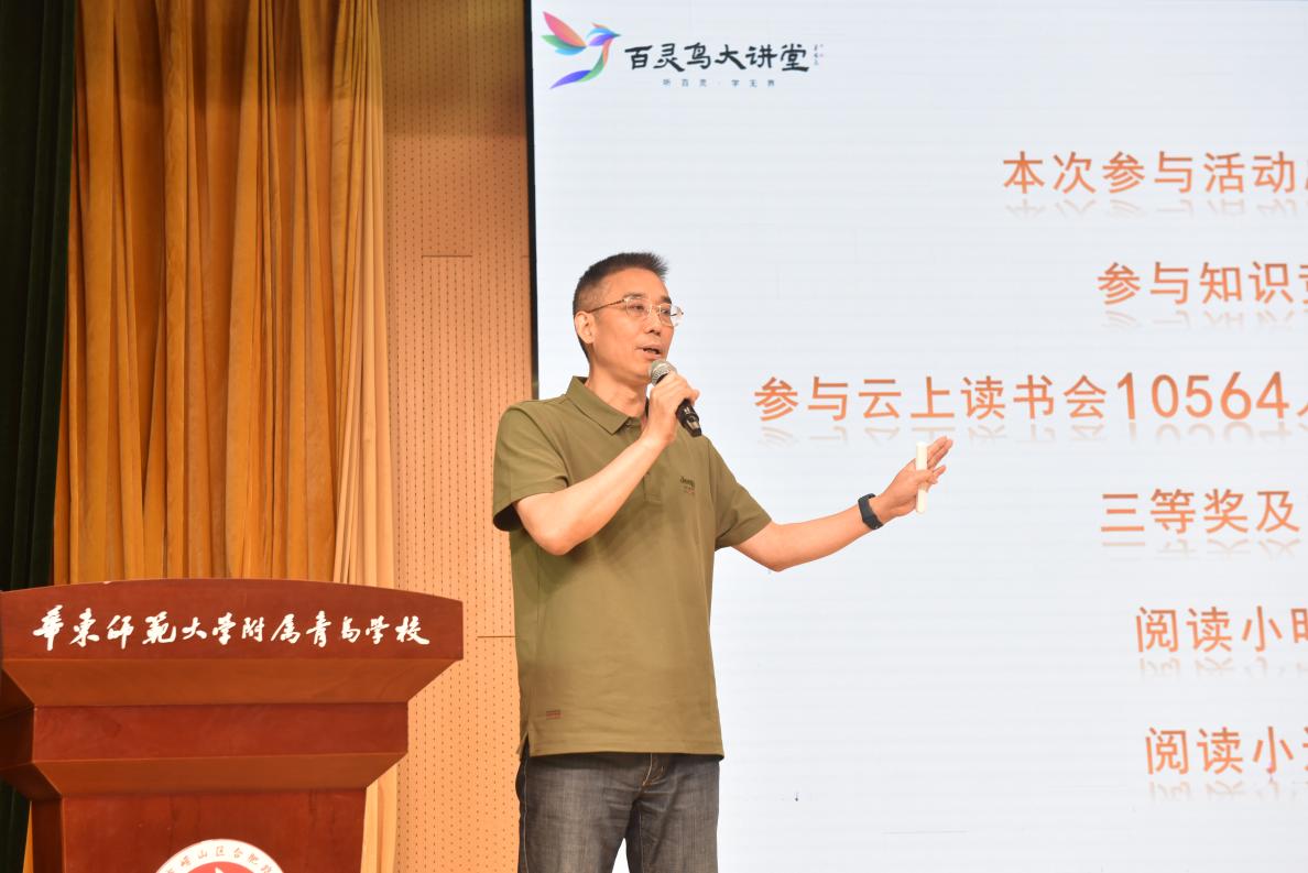市教育学会秘书处主任刘思硕在致辞中首先对获奖学校、学生表示祝贺。他表示,本届活动通过“AI知识挑战赛”“云上读书会”等创新形式,实现了覆盖广度、育人深度、社会联动三个层面的突破,吸引全市近三万名小学生参与,分享阅读交流感悟近6万次,形成“以赛促读”的辐射效应。他指出,今天的颁奖不是终点,而是全民阅读新征程的起点,一是学校要担纲主阵地、不断深化“书香校园”建设,如西海岸新区辛安小学借课程与AI创新推动阅读,合肥路小学开展“融合阅读”提升核心素养,麦岛小学构建立体化育人体系等实现阅读场景全覆盖;二是家庭要当好启蒙者,家长应践行“亲子共读计划”,以“书房陪伴”取代“屏幕消耗”,共建学习型家庭;三是社会要构筑能量场,依托猫头鹰图书馆、城市书房等打造“15分钟阅读圈”,推动“书行中国”等公益品牌项目,让齐鲁书香飘向每个角落。