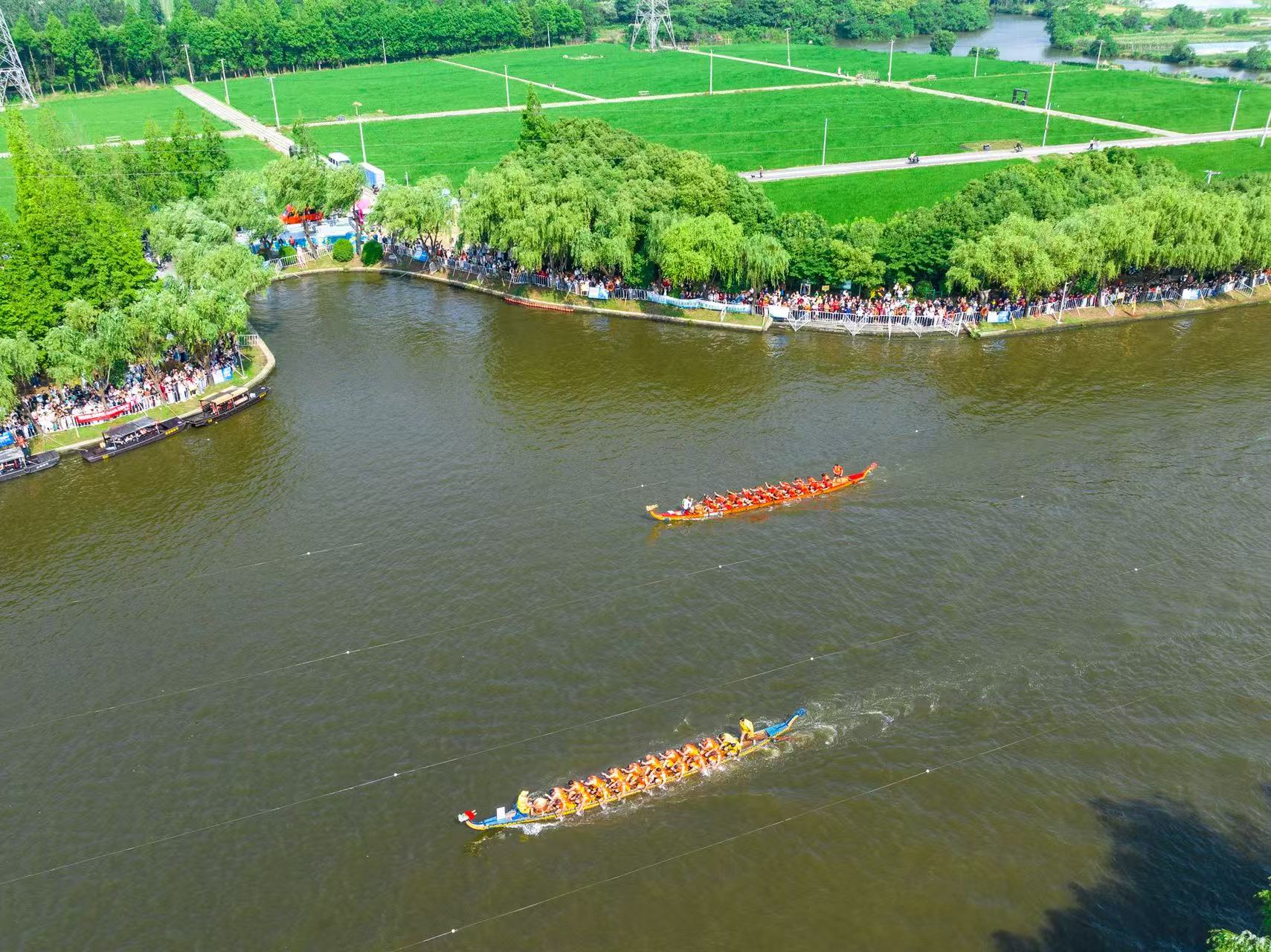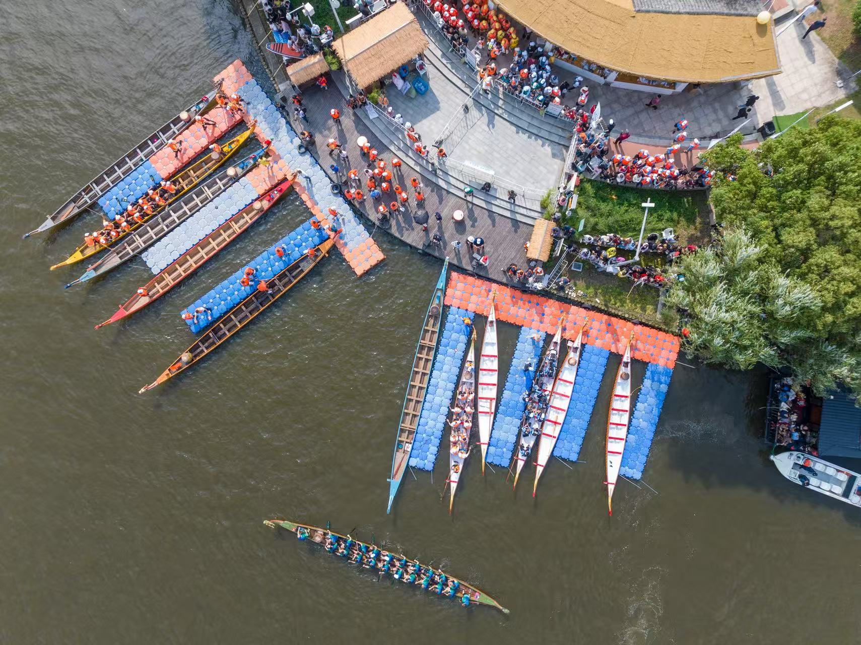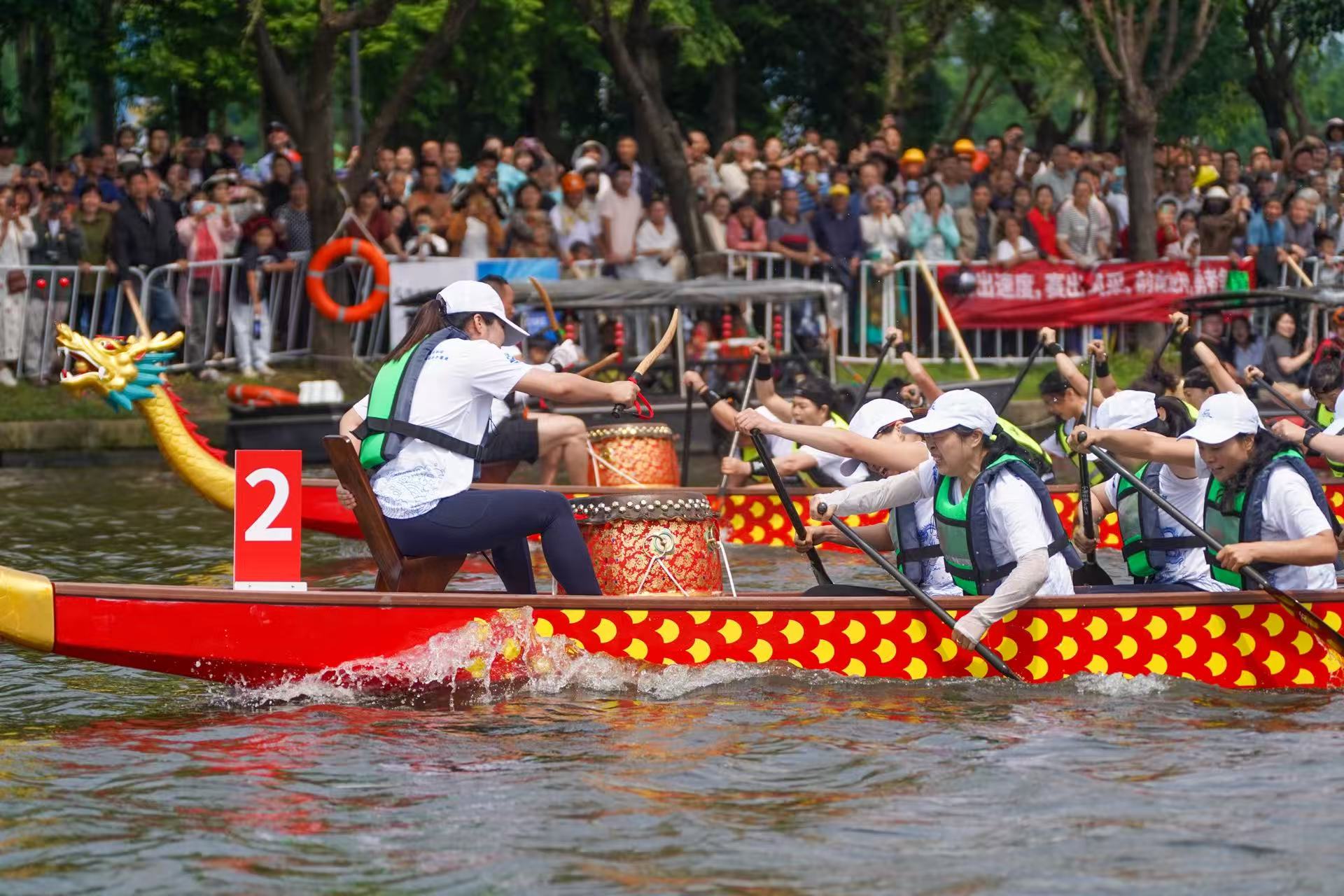 河面上,龙舟竞渡;在岸边,龙舟造“浪”集市吸引不少观众,大家品尝米食特色小吃,挑选香囊等文创产品,现场体验包粽子,趣味十足。