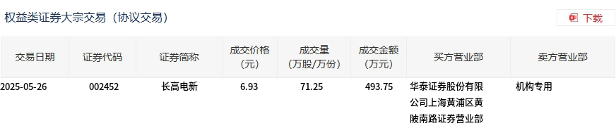 长高电新今日大宗交易平价成交71.25万股,成交额493.75万元