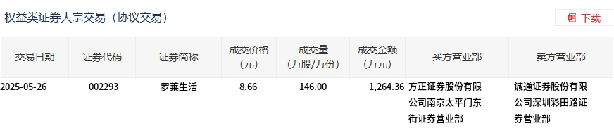 5月26日,罗莱生活大宗交易成交146万股,成交额1264.36万元,占当日总成交额的14.73%,成交价8.66元,较市场收盘价9.13元折价5.15%。