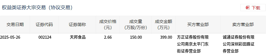 5月26日,天邦食品大宗交易成交150万股,成交额399万元,占当日总成交额的3.23%,成交价2.66元,较市场收盘价2.95元折价9.83%。