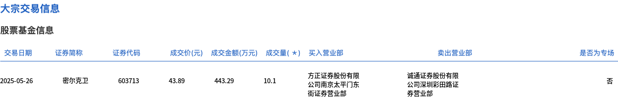 密尔克卫今日大宗交易折价成交10.1万股,成交额443.29万元