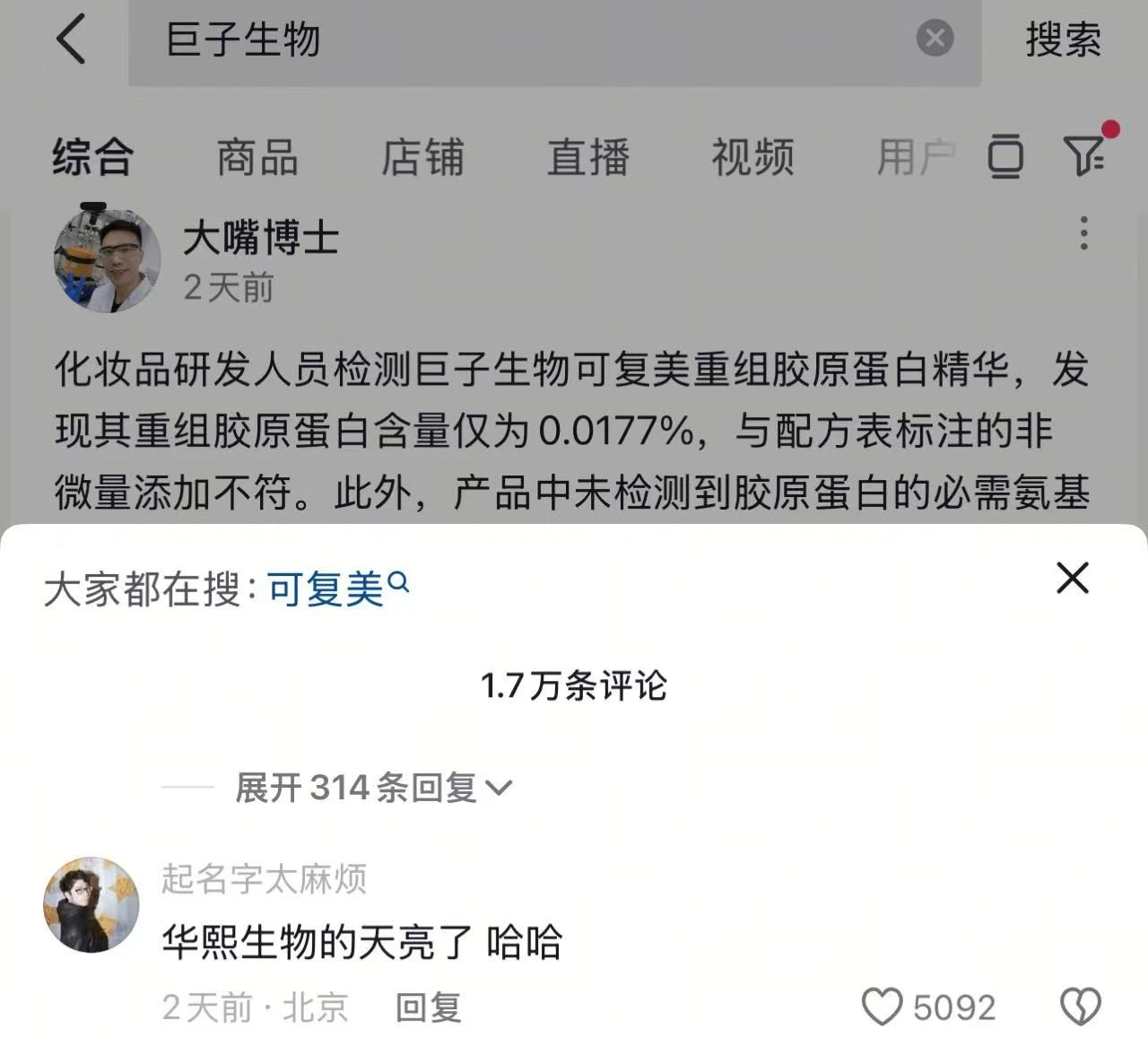 5月24日,抖音粉丝超350万的美妆博主“大嘴博士”的一则检测视频,让可复美的账号评论区陷入疯狂,成千上万条质问瞬间涌入。而这场风暴的核心,直指国产护肤龙头巨子生物的核心技术命脉:重组胶原蛋白。