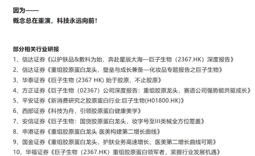 此外,华熙生物还在文章末尾列出信达证券、平安证券、方正证券、国金证券等9家针对医美行业和巨子生物的券商报告。