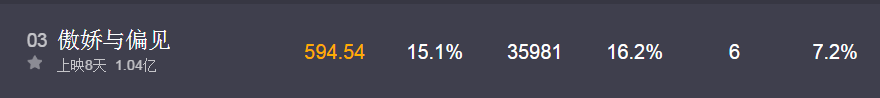 《傲娇与偏见》作为一部主打都市年轻女性的爱情喜剧,在受众上和《速8》并不冲突。上映首日拿下了16%的市场份额,首周末虽然在排片占比上略有下降,但是单日票房一度升至2000万。致使,该片目前累计票房已经破亿。