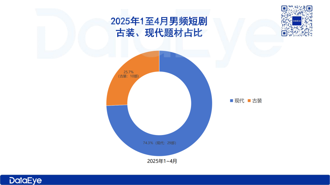 结合DataEye数据显示,2025年1月至4月TOP20 热力值榜单中,古装题材共有10部,现代题材共有29部,其中现代题材总占比约74.3%。