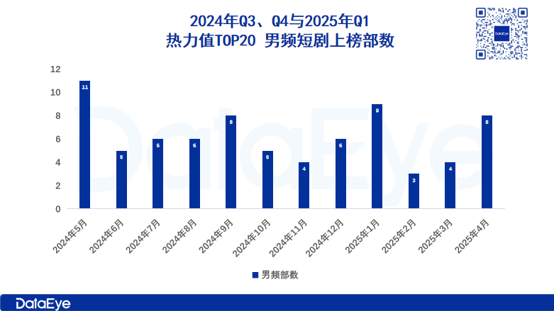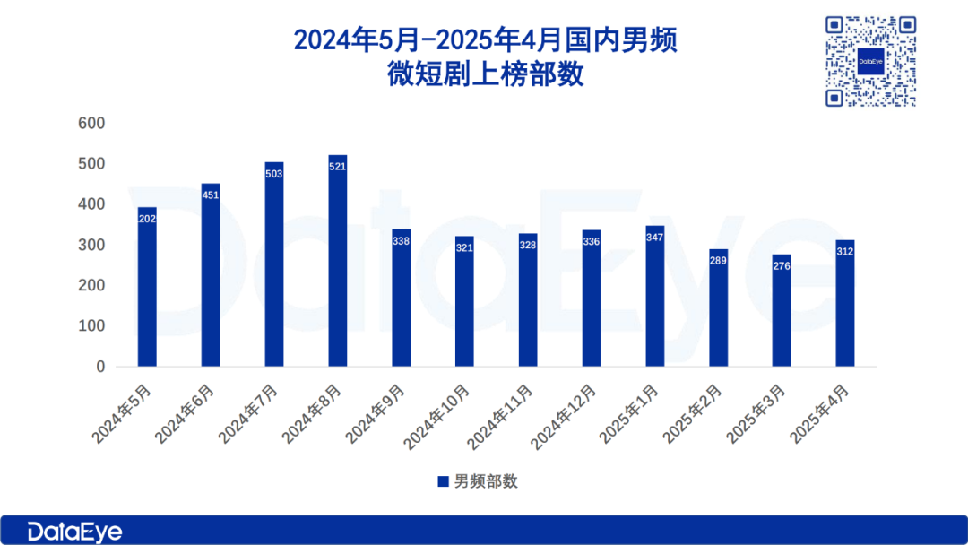 根据DataEye数据显示,2024年5月至2025年4月期间,男频微短剧市场呈现持续低迷态势,平台上榜数量显著下滑。如图所示,男频微短剧产量从2024年8月的峰值521部持续回落至目前的312部,季度平均产量由2024年第三季度的每月454部下降至当前每月306部,降幅达32.6%。