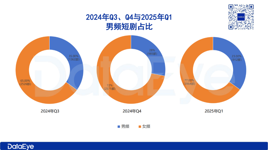 从市场占比来看,2025年第一季度国内平台推送的3964部微短剧中,男频题材仅有911部,总占比23%,较2024年第三季度占比下滑12%。尽管近期市场出现回暖迹象,但整体仍处于调整阶段,男性观众流失现象较为明显。