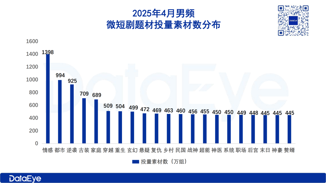 2025年4月的男频微短剧(类型)投量素材数分析,情感题材投放1398万组排名第一,都市题材投送994万组位居第二,逆袭题材投放925万组位列第三。由此可见,男频赛道依旧以情感、都市、逆袭为核心题材元素,占据男频主流赛道。