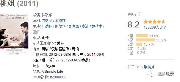 叶德娴本人也是依靠这部《桃姐》的出色演出,一举拿下了第68届威尼斯电影节沃尔皮杯最佳女演员奖。不装逼的说法呢,就是我们平时说的威尼斯影后。片子当中她饰演便是桃姐。这部片子是一个根据真人真事改编的故事。桃姐本来叫做钟春桃,原籍台山,因为家里太穷,出生不久就被人收养。后来养父又被人杀害,辗转之下被安排到梁家(天王饰演角色的祖上)做用人。她从十三岁起,先后照顾了梁家四代人一共有60多年。这便是片子的背景~